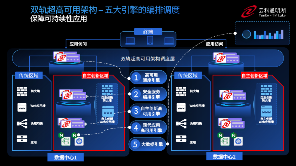 双轨超高可用架构在双活数据中心的分区调度基础上,增加信创域和非信创域的分域调度,实行信创域与传统域应用全量部署,使双中心运营变为双中心四区域并行运行,互为多活,将传统架构变为分区分域协同的多活双轨超高可用架构。帮助客户在新架构下,保障“信创”的同时解决性能瓶颈,提升稳定性,保证应用可持续性,最终实现信创区域和非信创区域的平滑过渡,完成国产化替代目标。